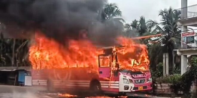 നാട്ടുകാരും അഗ്നിരക്ഷാ സേനാ അംഗങ്ങളും ചേര്ന്നാണ് തീ അണച്ചത്. അതേസമയം ബസ്സ് കത്തിയതില് ദുരൂഹത ആരോപിച്ച് ബസ് ഉടമ യൂനുസ് അലി രംഗത്തെത്തിയിട്ടുണ്ട്. സമൂഹ മാധ്യമങ്ങളില് കൂടി ചിലര് ബസ് കത്തിക്കുമെന്ന് ഭീഷണിപ്പെടുത്തിയിരുന്നെന്ന് യൂനുസ് പറഞ്ഞു. മനപ്പൂര്വ്വം ആരോ ബസ് കത്തിച്ചു എന്ന രീതിയിലാണ് ഉടമയുടെ പ്രതികരണം. സംഭവത്തെ കുറിച്ച് സമഗ്ര അന്വേഷണം വേണമെന്നും ഉടമ ആവശ്യപ്പെട്ടു.