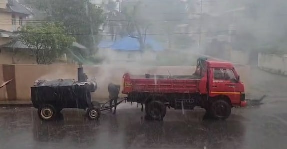 തൃശൂരിൽ കനത്ത മഴയത്ത് ടാറിങ്: കരാറുകാരെ ഓടിച്ച് നാട്ടുകാർ